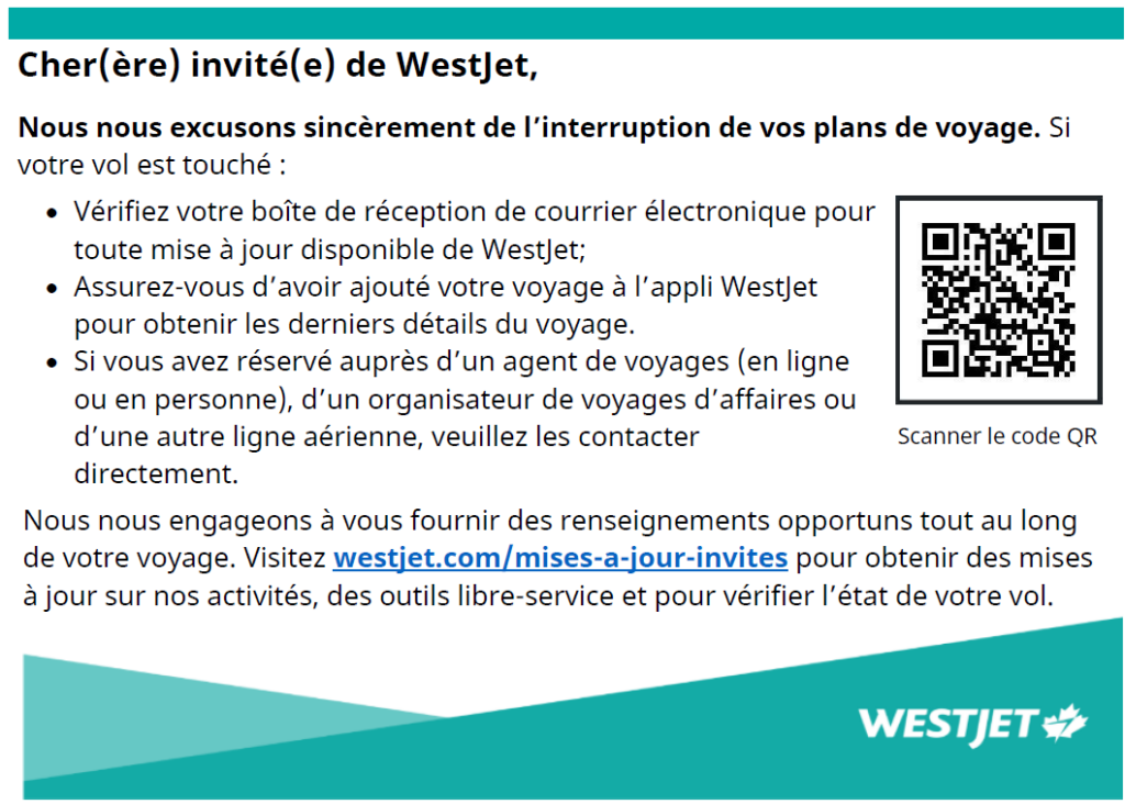 WestJet rencontre actuellement des problèmes techniques à l’échelle de son réseau qui ont des répercussions sur ses vols. Si vous avez un vol prévu, veuillez vérifier auprès de ligne aérienne pour obtenir les informations les plus récentes.